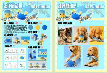 “汪洋总动员”系列宠物毛绒玩具,是一款融合海洋主题趣味与宠物行为需求的创新设计作品。设计灵感以章鱼、螃蟹、虾三类海洋生物为原型,通过简化特征、放大圆润体态的设计手法,打造出一组安全又生动的“海底玩伴”。作品聚焦于互动与安全双核心:章鱼的麻花辫触手、螃蟹的绳结腿等编织绳结构,不仅生动模拟生物形态,更作为耐啃咬、可拉扯的互动触点,激发宠物本能玩乐行为。整体采用明快清新的蓝黄配色,在呼应海洋主题的同时增强视觉辨识度,方便宠物追踪。材质上选用耐磨耐咬的毛绒面料,并贯彻全身无锐角的圆润设计,杜绝玩耍中潜在风险,全方位守护宠物安全。本系列旨在通过“趣味互动”与“安全陪伴”的双重设计,实现“陪伴、乐趣、安全”三者的有机统一,让宠物在每一次游戏中,都能享受如同潜入汪洋般的自在快乐。