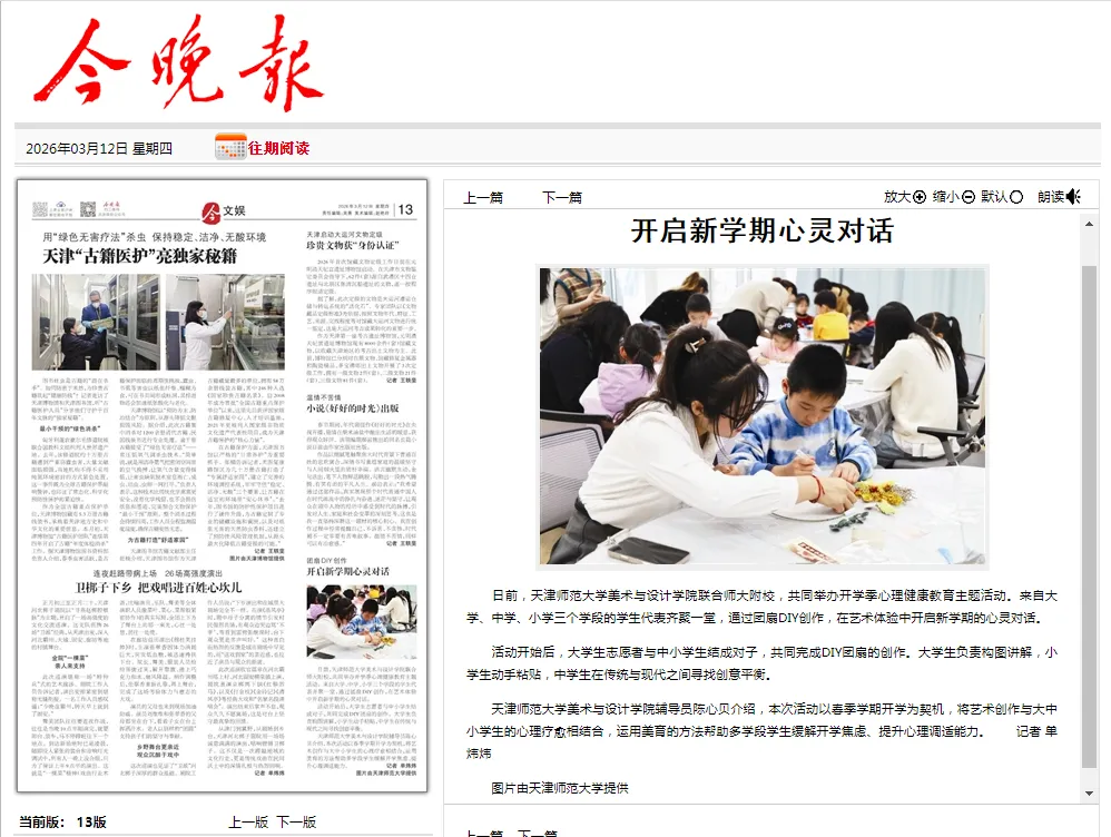 近日,美术与设计学院联合师大附校共同举办的“制‘扇’至美”—团扇DIY心理疗愈工作坊,获得今晚报、津云客户端两家主流媒体的关注与报道。媒体以图片新闻、深度特写等形式,记录下大学生志愿者与中小学生共同创作干花团扇、疗愈心灵的温暖瞬间,引发了广泛的社会好评。