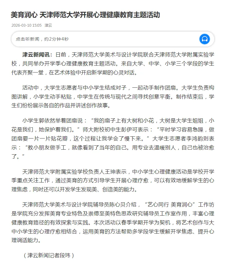 津云客户端以《美育润心 天津师范大学开展心理健康教育主题活动》为题进行了专题报道。