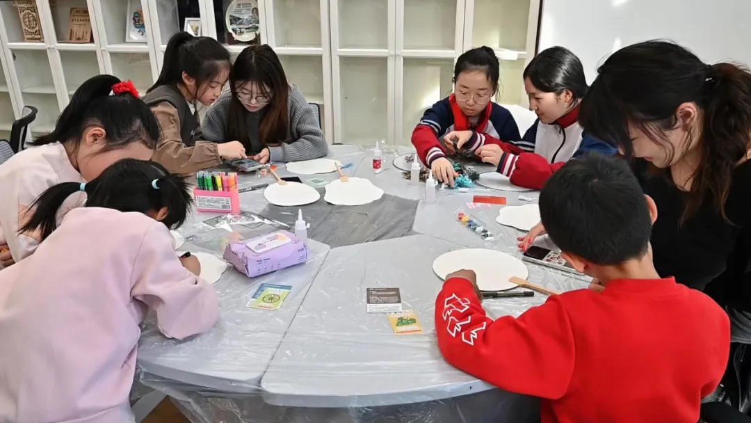活动伊始,学生们在志愿者引导下闭眼冥想,通过呼吸调整状态,为接下来的手工创作积蓄专注力。随后,大学生志愿者与中小学生结成“一对一”创作小组,共同完成干花团扇的制作。大学生负责构图讲解,小学生动手粘贴花瓣,中学生在传统与现代之间寻找创意平衡。不同年龄段的学生在协作中自然交流,现场氛围轻松而愉悦。